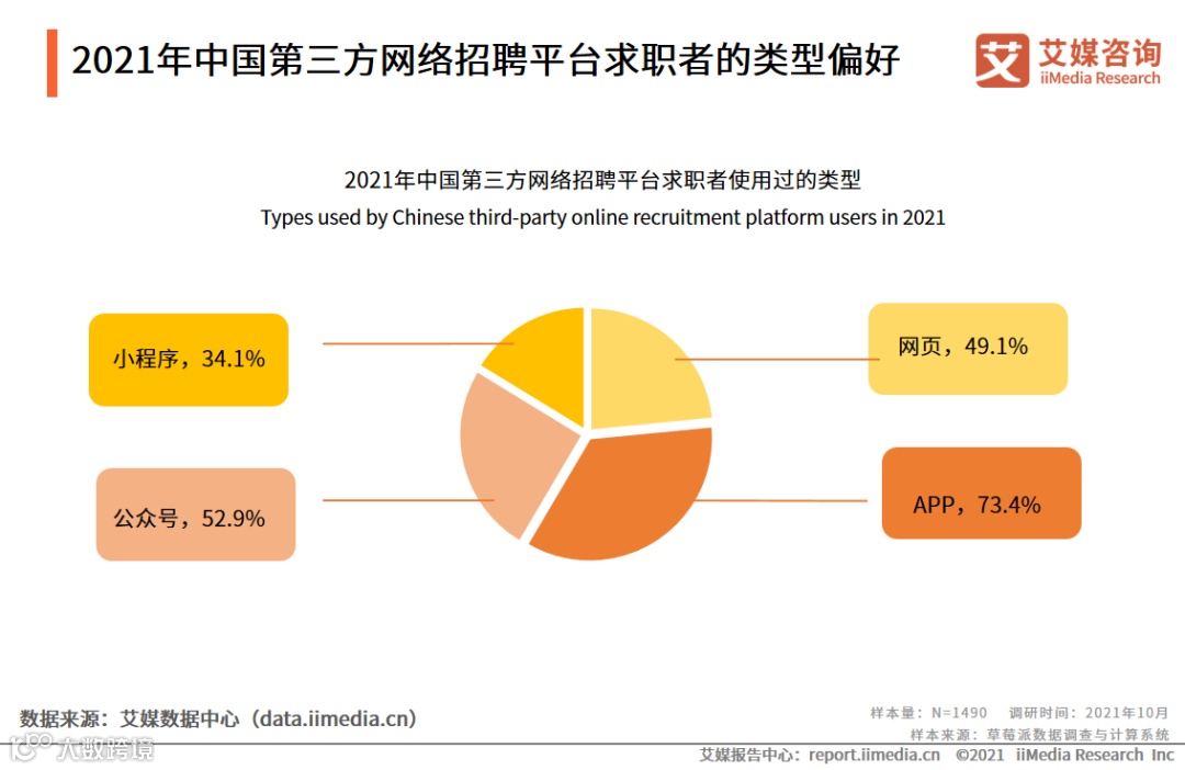 iiMedia Research(艾媒咨询)数据显示,使用过第三方网络招聘APP的求职者数量占比最高,达到73.4%,其次为第三方网络招聘公众号,使用人数比例为52.9%。艾媒咨询分析师认为,APP适应当代网民的移动端上网习惯,功能齐全,无需重复登录,方便求职者在各种场景下的使用,因而受青睐度较高。