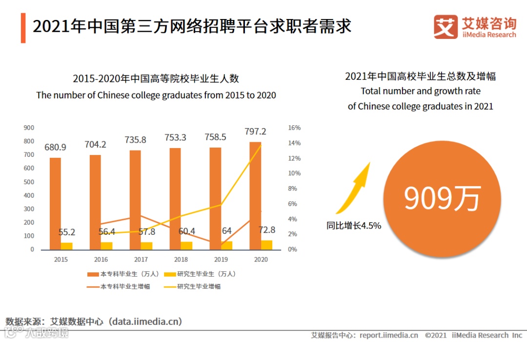 数据显示,近年来高校毕业人数屡创新高,2020年本专科毕业人数同比增长5.1%,研究生同比增加13.8%。2021年6月,中国高校毕业生达909万人,同比增长4.5%,其中有求职需求的毕业生至少600万人。此外,数百万2022届高校毕业生也将在2021年下半年寻求就业,加上想要跳槽的潜在求职人员,2021年全社会求职人数将超1000万人。艾媒咨询分析师认为,求职者数量的不断上升将驱动第三方网络招聘市场C端需求持续释放。