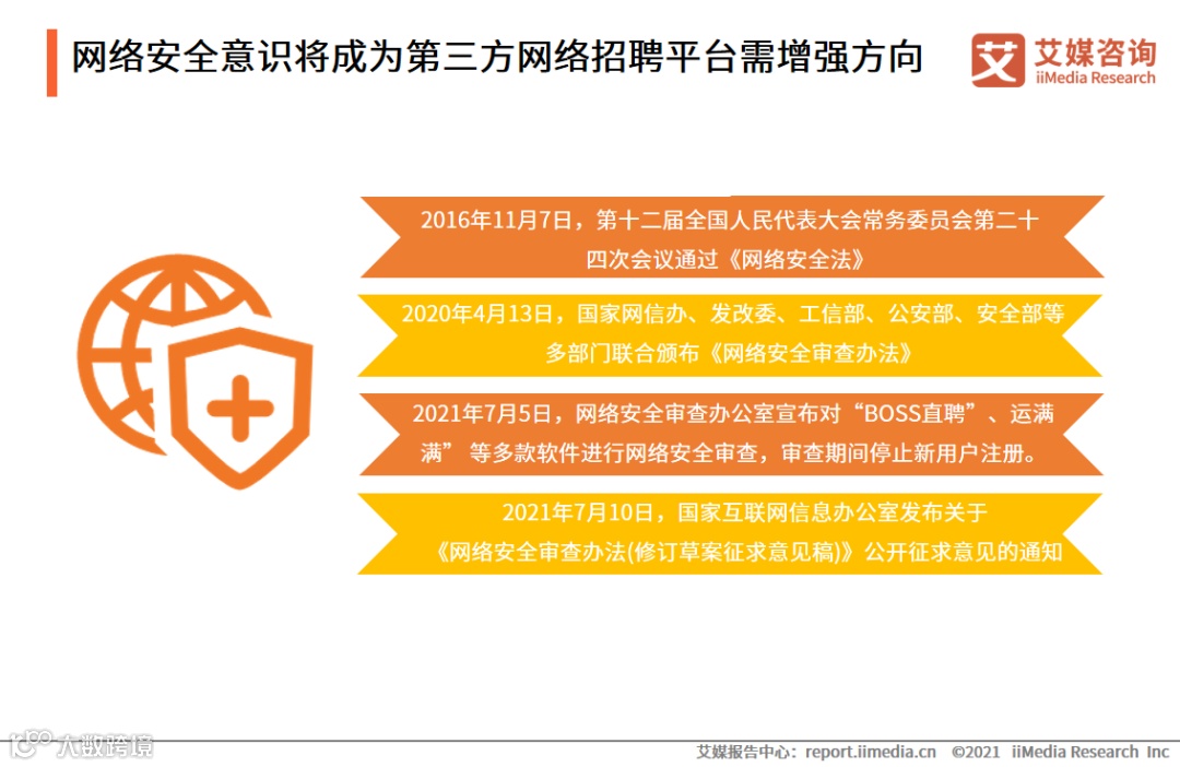 网络安全不仅关乎个人数据与隐私保护,更是国家安防与战略决策层面重要事项。我国目前拥有《国家网络安全法》、《网络安全审查办法》等多部相关法律。2021年7月5日,“BOSS直聘”在内的多款软件应用被实行国家网络安全审查。艾媒咨询分析师认为,网络招聘软件收录有大量求职者详细简历信息,其网络安全问题重要性尤为突出,相关平台有必要加大对用户个人信息与相关数据保护方面的多方位投入,承担相应社会责任。
