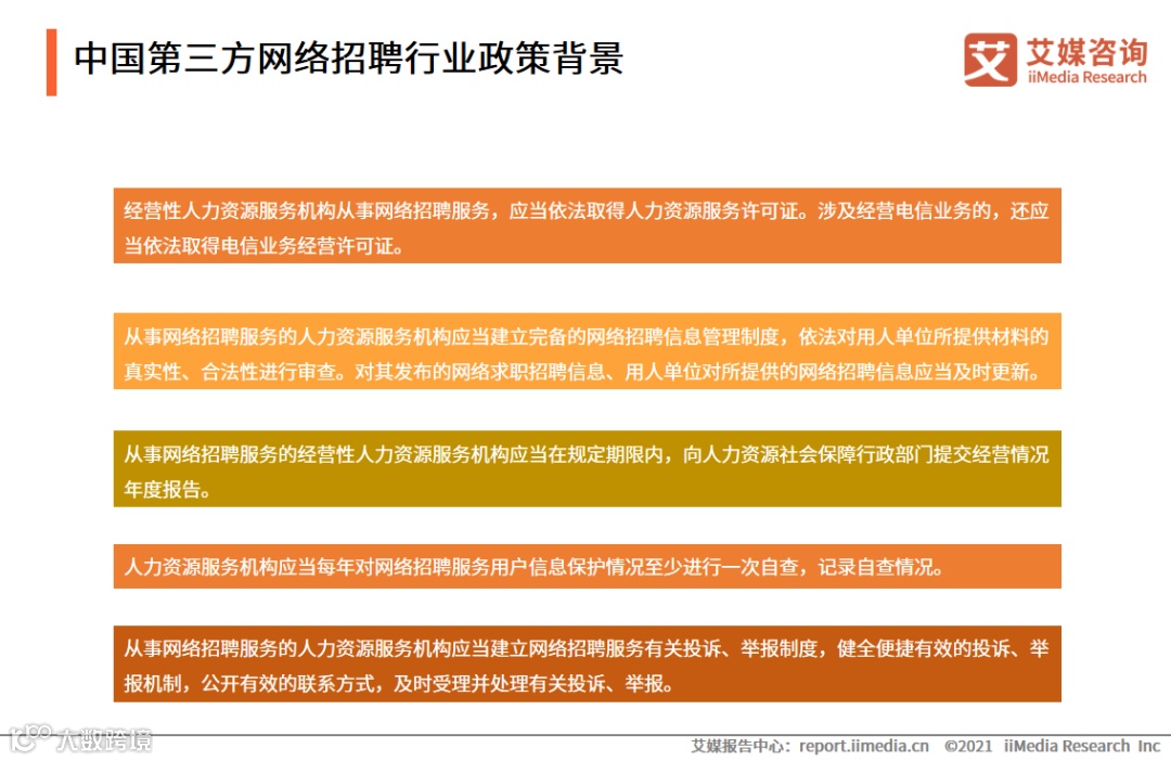 2020年12月7日,人力资源社会保障部第54次部务会审议通过《网络招聘服务管理规定》,这是我国第一部专门针对网络招聘领域的部门规章,2021年3月1日起施行。规定对网络招聘服务提供方的经营许可、信息审核、经营情况汇报、信息保护、服务优化等多方面作出了要求。艾媒咨询分析师认为,未来第三方网络招聘平台需要更加重视其平台责任的履行与规范经营,网络招聘行业市场发展将逐步进入有序发展通道。