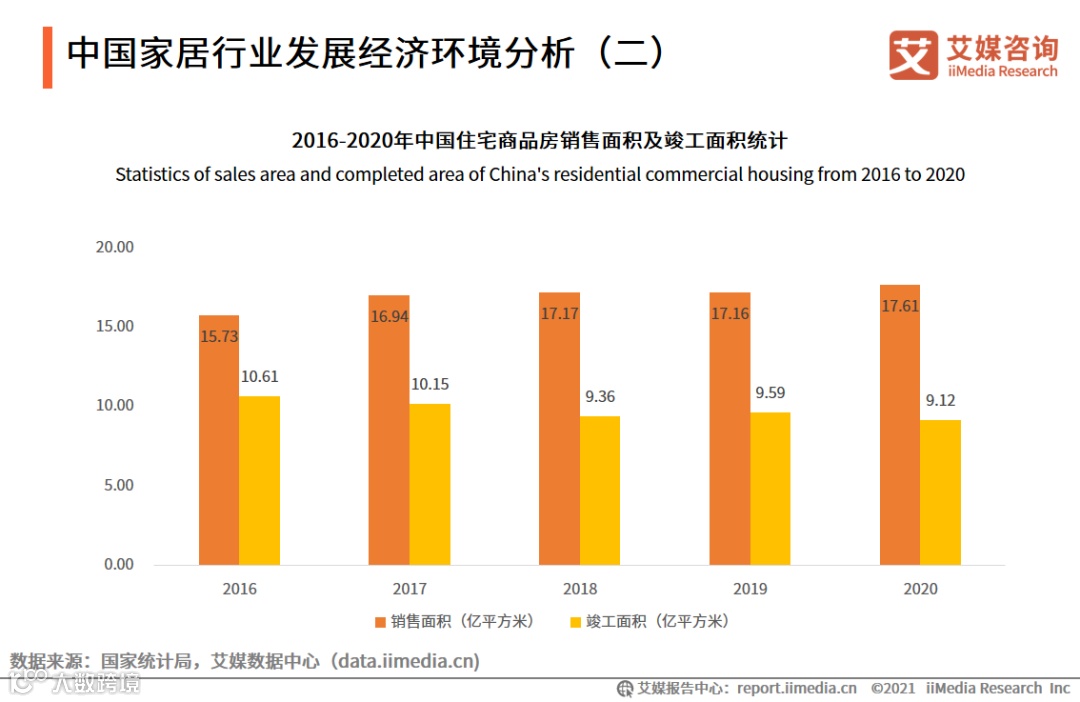 数据显示,近年来,中国商品房销售面积保持上涨势头,竣工面积小幅下降。2020年中国商品房销售面积为17.61亿平方米,同比增长2.6%。艾媒咨询分析师认为,房地产市场需求持续增长,为家居行业提供良好的发展空间。
