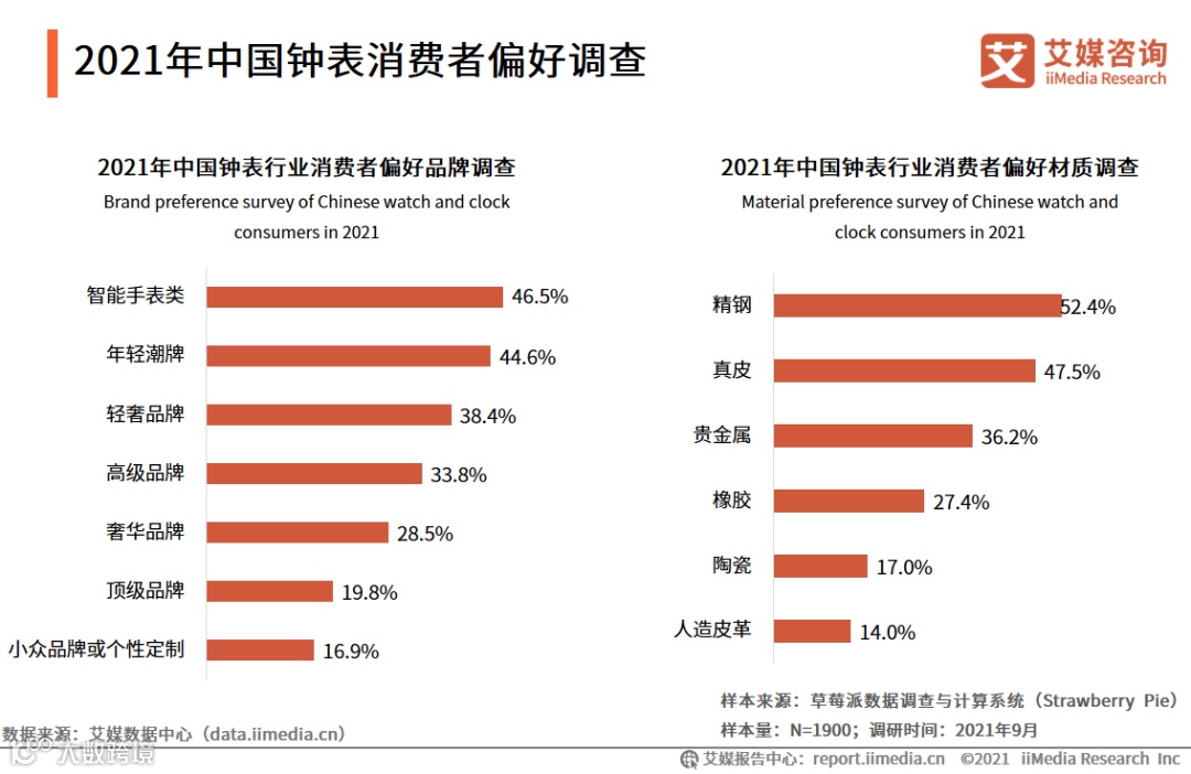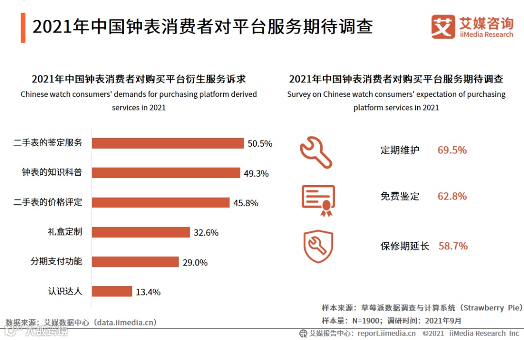 iiMedia Research(艾媒咨询)数据显示,中国钟表衍生的消费服务诉求主要有二手表鉴定(50.5%),钟表的知识科普(49.3%)及二手表的价格评定占45.8% 。而定期维护(69.5%)、免费鉴定(62.8%)和保修期延长(58.7%)是中国钟表消费者对平台服务的三大期待。