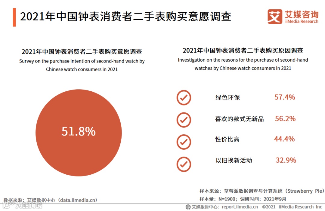 研究报告数据显示,51.8%的消费者表示会购买二手表,其中有超过五成的消费者表示购买二手表的原因是倡导绿色环保理念(57.4%)及喜欢的款式无新品(56.2%),而性价比高、以旧换新活动也是消费者购买二手表的原因之一,占比分别为44.4%、32.9%。
