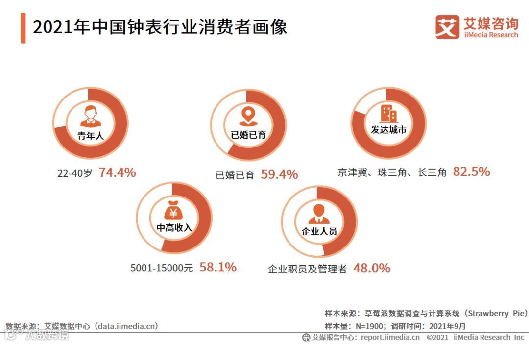 研究报告数据显示,2021年中国钟表行业消费者以22-40岁的青年群体为主,占比达77.4%,主要居住在中国核心经济带。同时,已婚已育人群占近6成,职业为企业人员占近5成,平均月收入5001-15000元占近6成。