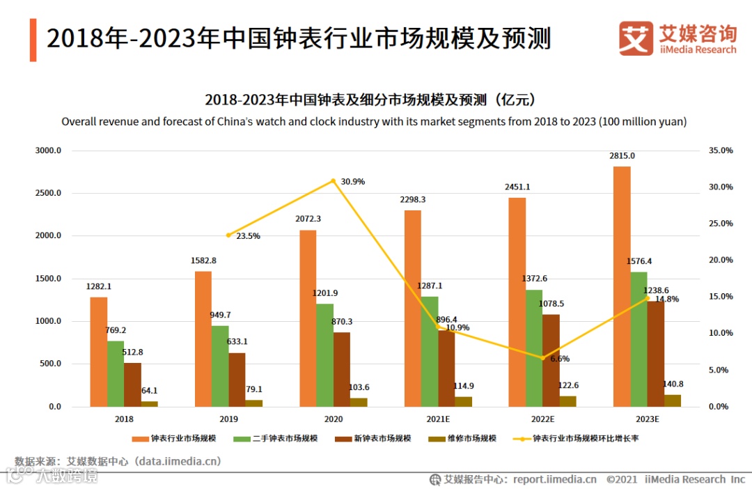iiMedia Research(艾媒咨询)数据显示,2018年-2020年中国钟表市场规模实现高增长,2020年达2072.3亿元,其中二手钟表市场规模为1201.9亿元,新钟表市场规模为870.3亿元,维修市场规模为103.6亿元。