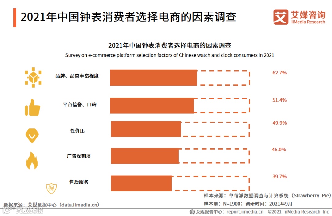 根据调研数据显示,2021年中国钟表消费者选择线上电商平台的因素主要有五个,比重最大的因素是品牌、品类丰富程度占62.7%,平台信誉口碑(51.4%)、性价比(49.9%)、广告深刻度(46.0%)和售后服务(39.7%)均为相对重要的选择因素。