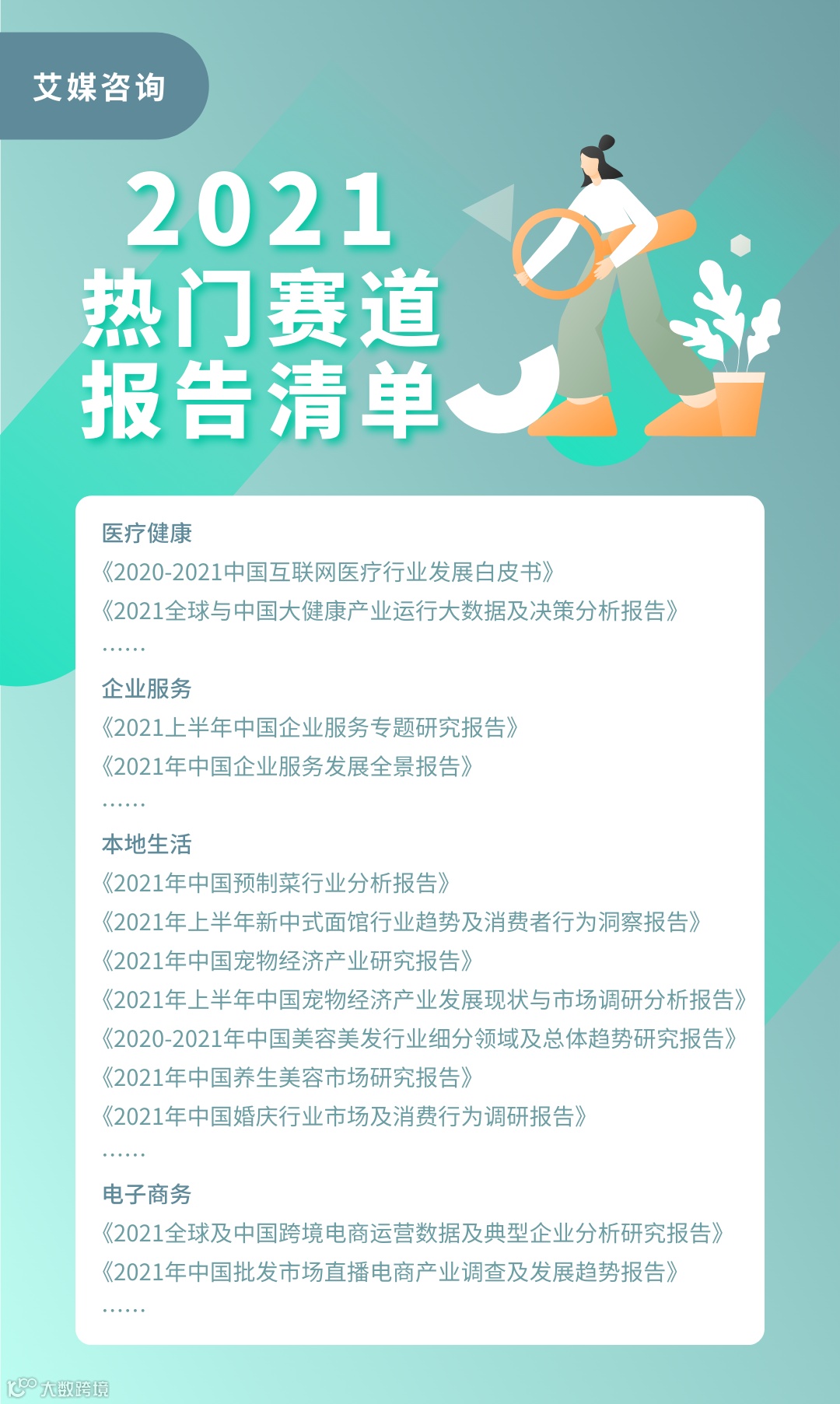 以上仅节选了企业服务、本地生活两大热门行业进行分析,针对资本关注的众多热门行业,艾媒君做了以下报告盘点推荐: