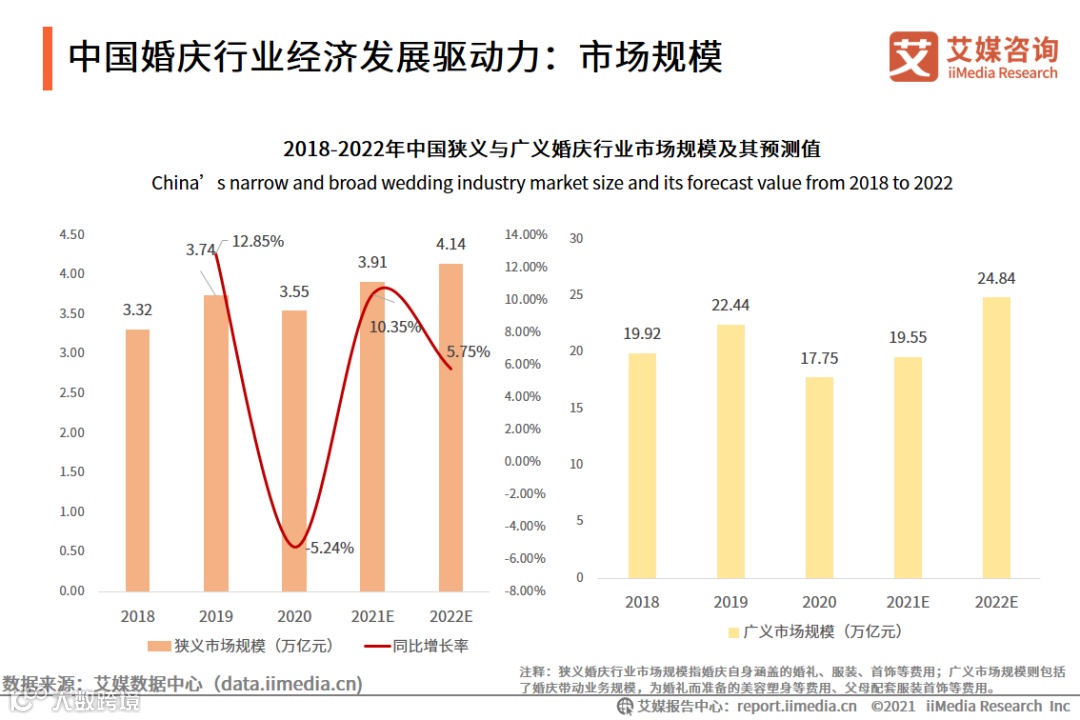 随着居民收入的增加和生活品质的提高,婚庆质量要求逐年上升,形式趋于多样化,形成了巨大的增量市场。婚庆市场有狭义广义之分,广义主要包括婚庆行业及其带动的周边行业。iiMedia Research(艾媒咨询)数据显示,由于疫情的影响,2020年的婚庆行业市场规模有小幅度下跌,但随着国内疫情逐渐得到控制,婚庆市场将会重回增长态势,预计2022年中国狭义婚庆行业市场规模将突破4万亿元,广义市场规模将超过24万亿元。