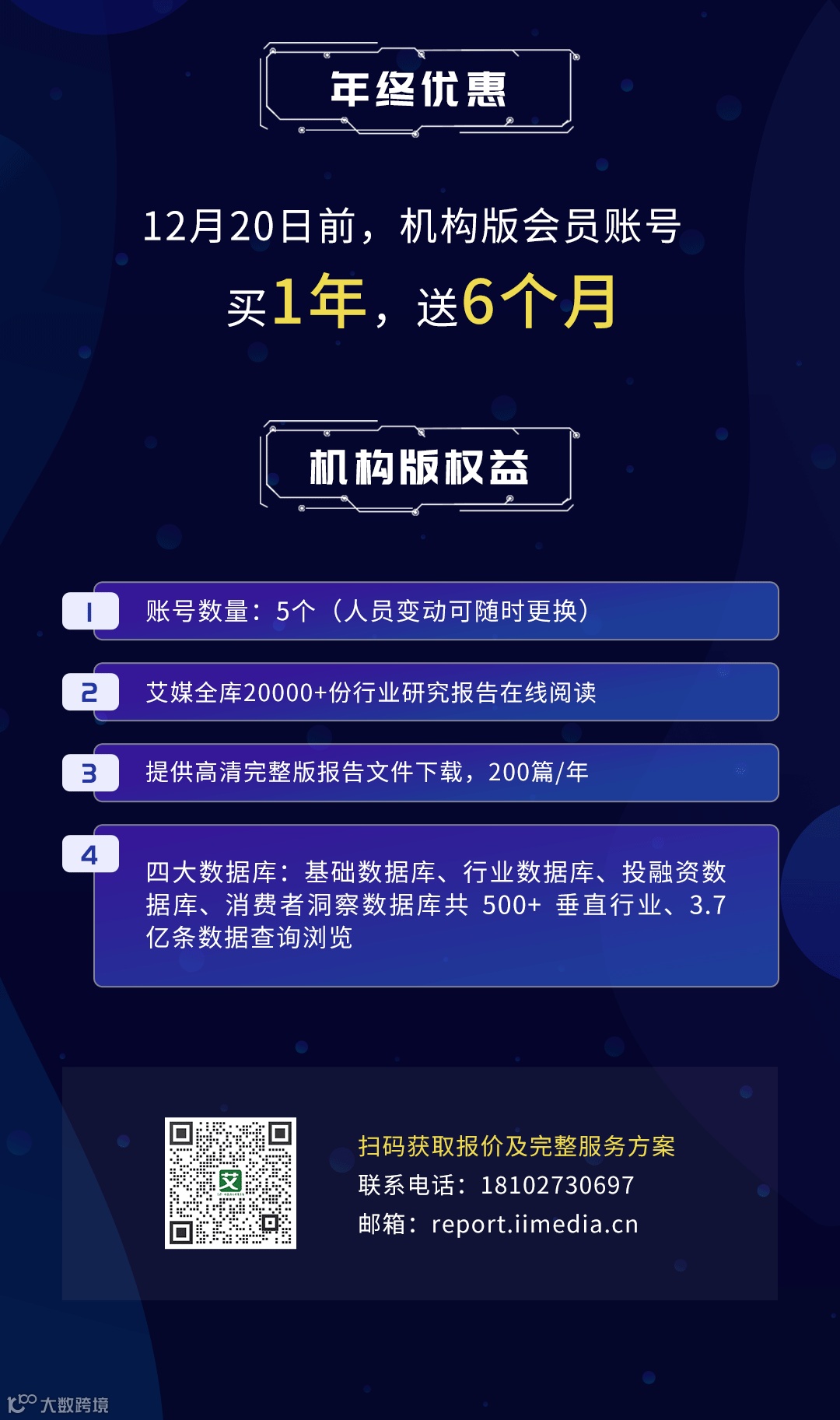 为了给广大用户提供更高质的服务,助力各行业洞察市场趋势,用数据辅助科学决策,艾媒咨询旗下“艾媒数据智库”重磅上线年终优惠活动,全库20000+行业报告、3.7亿条全域数据,覆盖广、质量优,不仅能让你“一键”拥有以上清单内容,还可以全年阅读艾媒研究数据成果、掌握2022市场新动向、新趋势。