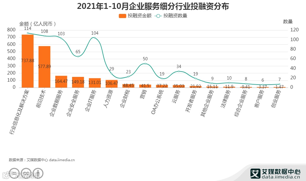 资本环境方面,资本持续大力布局企业服务行业。iiMedia Research(艾媒咨询)数据显示,2020年国内企业服务领域共发生708起投融资事件,涉及金额达2092.27亿人民币。分领域来看,企业服务领域投资案例中,投融资金额TOP3的领域分别为行业信息化及解决方案 (114起,737.88亿人民币)、前沿技术(108起,577.89亿人民币)、企业数据服务(103起,164.47亿人民币)。