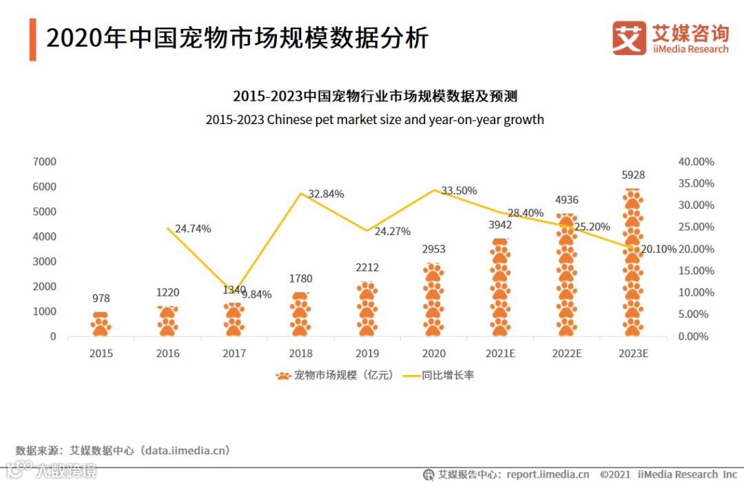 iiMedia Research(艾媒咨询)的数据显示,2015-2020年中国宠物市场规模呈持续增长态势,2020年市场规模为2953亿元,同比增长33.5%。随着社会发展使得养宠观念不断推广普及,市场的规模化发展使得宠物市场延伸服务不断完善,宠物市场发展前景较为乐观,预计到2023年,中国宠物行业市场规模将达到5928亿元。