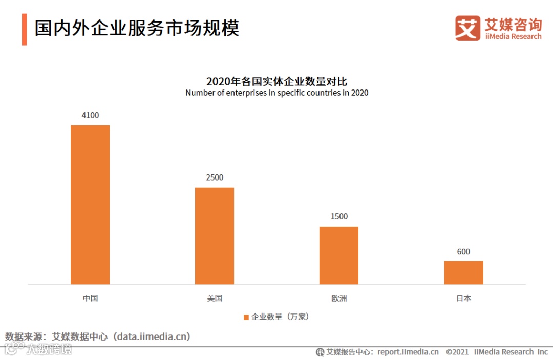 具体到在市场规模方面,中国拥有最大的企业服务市场,中国的实体企业数量达到4100万家,对应市场可达万亿以上,美国、欧盟和日本的实体企业数量分别只有2500万家、1500万家和600万家。