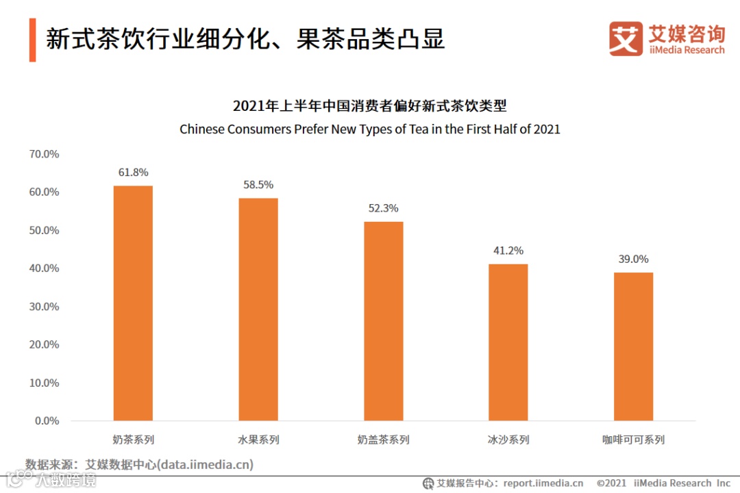 随着新式茶饮行业的竞争加剧,各类品牌向细分领域逐渐发展。艾媒咨询数据显示,2021年上半年中国消费者偏好新式茶饮类型中,水果系列排名第二。艾媒咨询分析师认为,随着新式茶饮规模增长和竞争加剧,茶饮市场已经显现出细分品类趋势,市场上出现了一类主打单品类的品牌,如7分甜的杨枝甘露、沪上阿姨五谷茶饮,而果茶品类受欢迎度高,多数品牌推出了水果类茶饮。