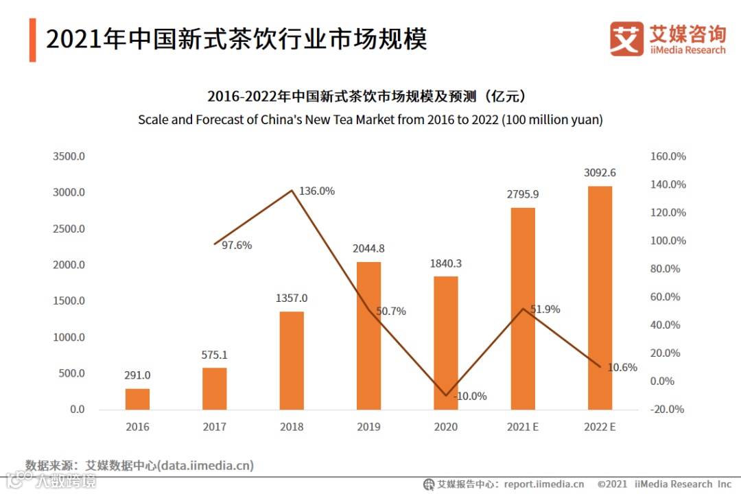 iiMedia Research(艾媒咨询)数据显示,2021年中国新式茶饮市场规模将达2795.9亿元,预计疫情后新式茶饮市场恢复迅速,同比上升51.9%。随着中国经济持续上涨,城镇化率进一步提升,预计2022年新式茶饮市场规模将突破三千亿元。