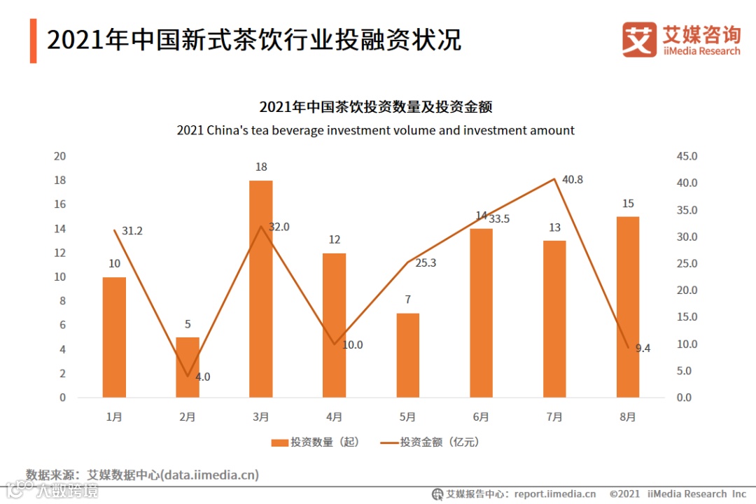 中国新式茶饮行业在这几年快速扩张后,发展步伐迅速,2021年1-8月投资数量已达87起,投资金额达179.2亿。艾媒咨询分析师认为,中国新式茶饮行业发展速度迅猛,大量资本的投入,有机会使得新式茶饮在口味、工艺、覆盖区域上冲破瓶颈,达到一个新的高度。