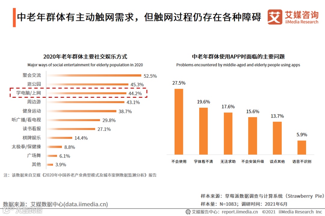 但研究报告显示,2020年有44.2%的老年群体选择学电脑/上网作为主要社交娱乐方式,但是在实际应用过程中,中老年群体存在不会使用、字体看不清、无法求助、不会安装升级等现实困难。