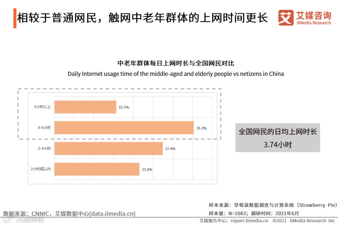 据CNNIC调研数据显示,全国网民的日均上网时长为3.74小时。而本次调研数据显示,在中老年群体中,有51%的中老年群体日均上网时长超过4小时。而据央视财经报道,有超过10万老人日均在线甚至超过了超过10个小时,比许多冲浪少年、熬夜少女都更为惊人!