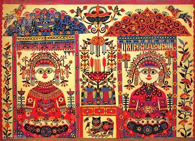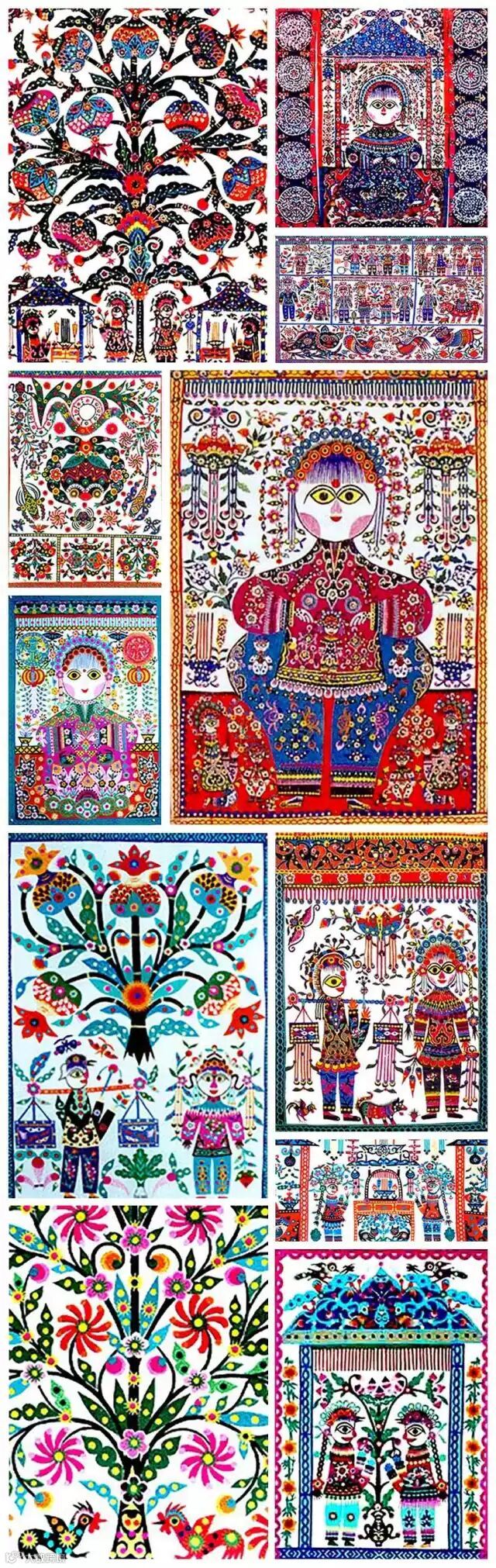 库淑兰的作品元素多来自日常生活元素及传统民谣,作品描绘着一幅幅生活百态图,牛羊猪狗、花草树木、她的每一幅作品都配有体现着几千年深厚的传统文化的歌谣。