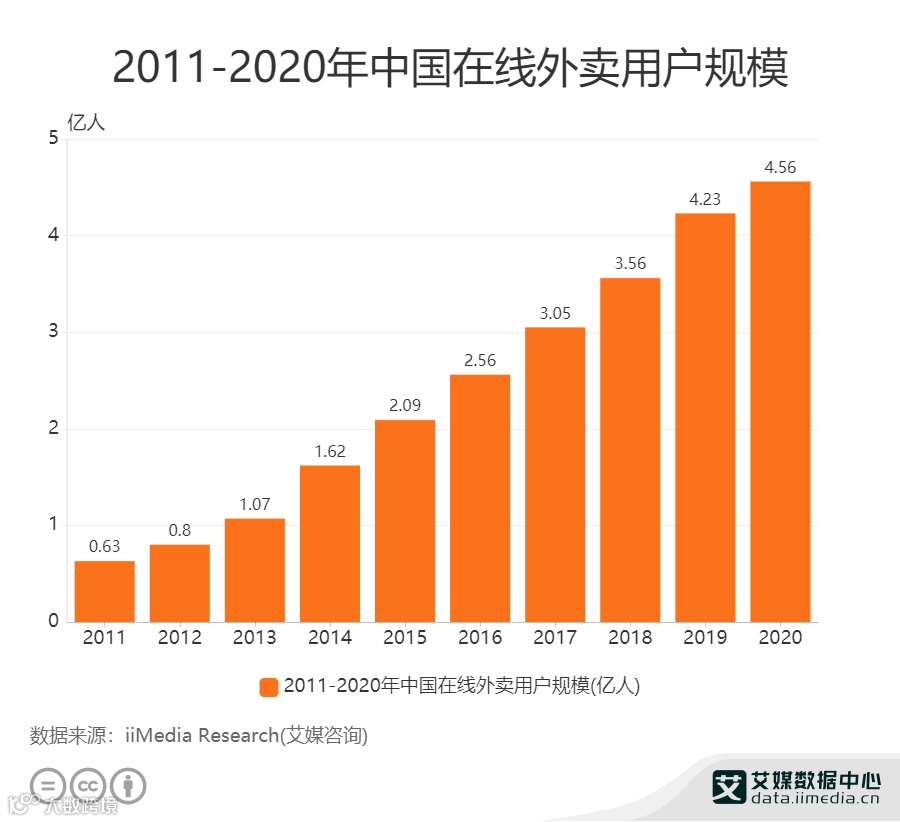 据艾媒咨询数据显示,2020年,我国在线外卖市场规模已达6646.2亿元,较2011年规模增长已增长超30倍。而近十年来,我国在线外卖用户数量稳步增加,2020年中国在线外卖用户规模已达4.56亿人,比2011年人数增加了近7.3倍。