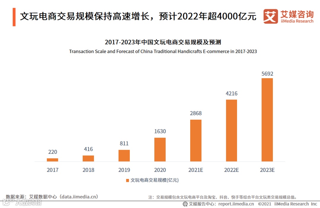 iiMedia Research(艾媒咨询)数据显示,2020年中国文玩电商市场交易规模为1630亿元,预计2022年将超过4000亿元。随着文玩的品类增加和消费价格亲民化,文玩逐渐从小圈子消费变成大众消费,推动行业的进一步发展。
