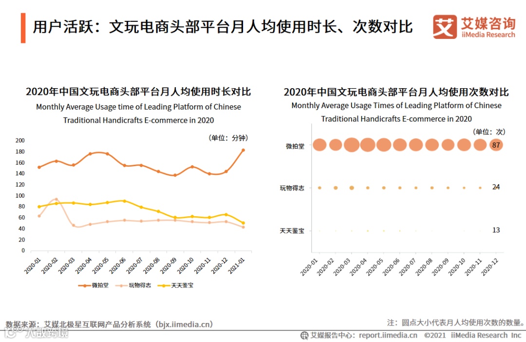 用户活跃:文玩电商头部平台月人均使用时长、次数对比