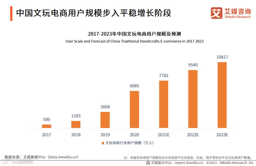 在疫情影响下,直播模式为文玩电商带来了新的风口,文玩电商的用户规模呈现跨越式增长。数据显示,2020年整体行业用户规模达6085万人。而在文化和精神消费不断增加的发展背景下,文玩电商用户规模步入平稳增长期,预计2023年用户规模将破亿。