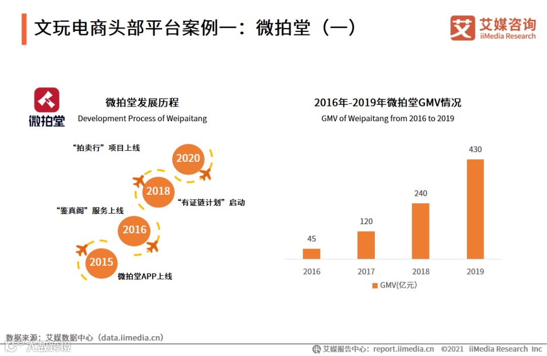 微拍堂成立于2014年,作为行业先行者,微拍堂为文玩电商行业提供了诸多富有价值的探索和实践,包括:首创“直播拍卖+免费鉴宝”的销售模式,为用户提供全新购物体验;推出“鉴真阁”平台,解决用户鉴定难、维权难等痛点;并在鉴定数字化方面推出“有证链”电子防伪证书,提高了商品的可溯源性、质量可信度,切实解决行业痛点。数据显示,近年微拍堂的交易额增长迅猛,2019年微拍堂的GMV达430亿元。