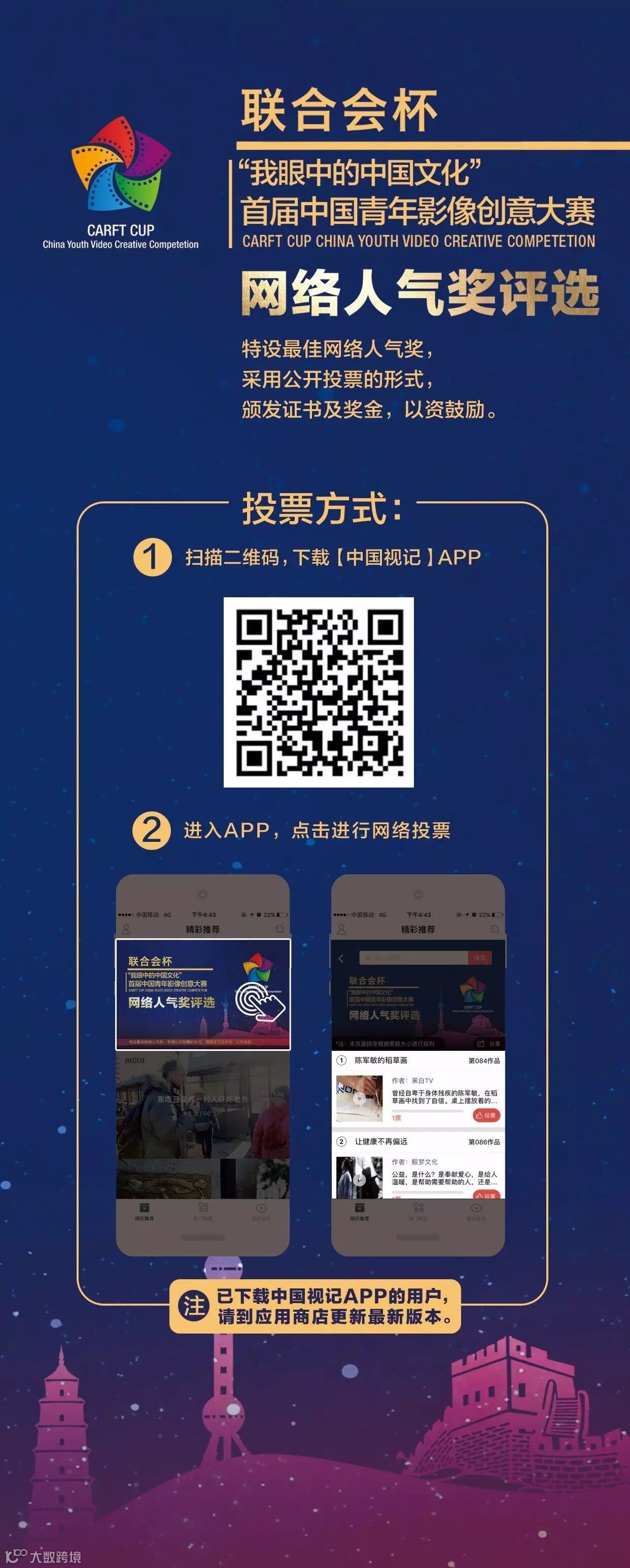 为了给全体参赛作品、创作团队打造更全面的展示平台,让更多聚焦中国文化的精品视频被更多人关注,大赛在专家评审的同时,特在新媒体平台《中国视记》发起网络评选,开设“最佳网络人气奖”及奖金5000元,并且获得“最佳网络人气奖”的作品仍可参与大赛其他11个主要奖项的角逐,获得相应证书及奖励。请到应用商店下载或更新最新版本的【中国视记】APP,为你喜欢的文化视频投上宝贵的一票。