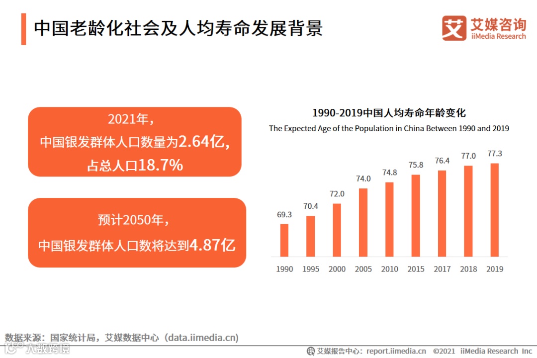第七次人口普查数据显示,中国60岁及以上的银发群体人口占比18.7%,达到2.64亿人。同时,中国人均寿命从1990年的69.3岁增长到2019年的77.3岁,得益于中国的人均预期寿命保持增长,老年群体面对的银发经济有高度增长空间。这同时也意味着在“十四五”期间,中国银发群体人口将突破3亿人,社会结构将从轻度老龄化迈入中度老龄化。