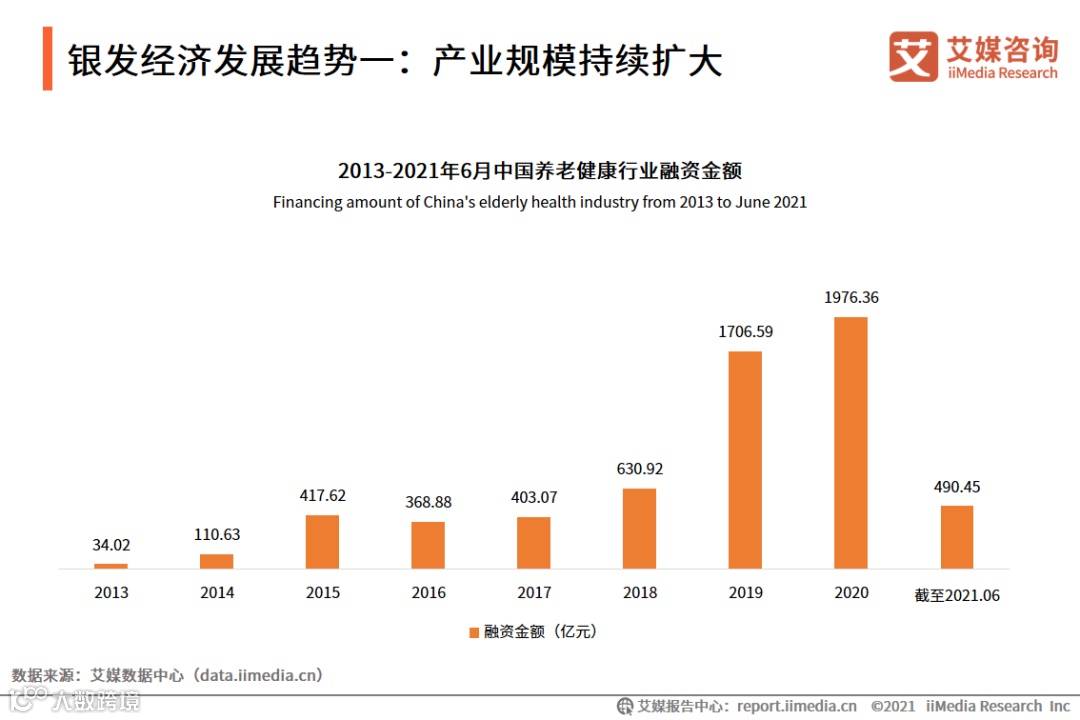 数据显示,2013-2020年,中国健康养老产业融资规模不断扩大,2020年融资规模达1976.36亿元。艾媒咨询分析师认为,资本进入有助于产业规模的进一步扩大,同时在服务质量提升、产品矩阵研发等方面也有了更好的支撑。