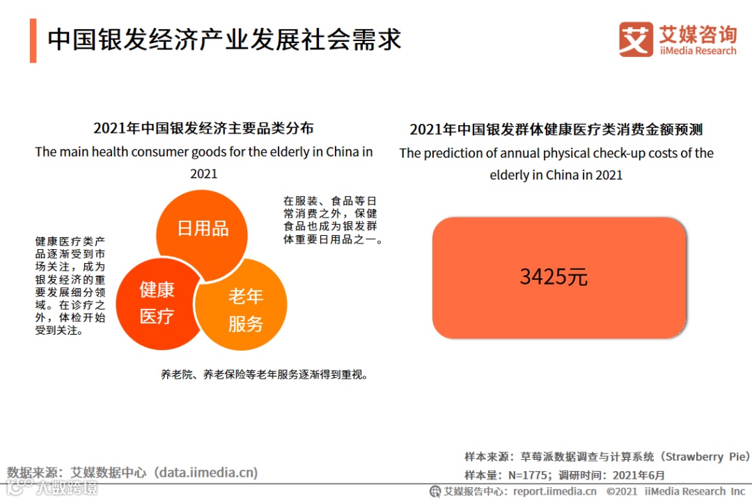 从银发群体的消费情况看,无论在日用品、健康医疗或是老年服务中,健康相关的支出都成为老年群体重要的消费诉求。iiMedia Research(艾媒咨询)调研显示,2021年中国银发群体健康医疗平均消费金额3425元。并且在疫情影响下,健康理念持续普及,体检等健康消费将有较大的增长空间。