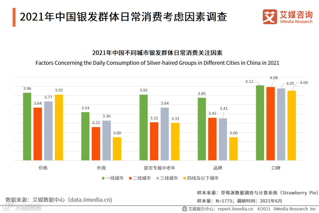 iiMedia Research(艾媒咨询)数据显示,银发群体在选购日用品时,对口碑的关注程度最高,平均受关注程度达到了4.07。而对产品外观的关注度则相对较低。从具体城市维度看,一线城市在购买银发日用品时,对各维度都需要综合考量;而小镇(四线及以下)消费者几乎只关注物品的口碑和价格。艾媒咨询分析师认为,在银发经济消费方面,城市差异是主要影响因素。高线级城市用户可选择品类多且更关注品质,因此在品牌切入过程中需要综合考量所有因素;而低线级城市的下沉市场则属于价格敏感型,关注性价比。