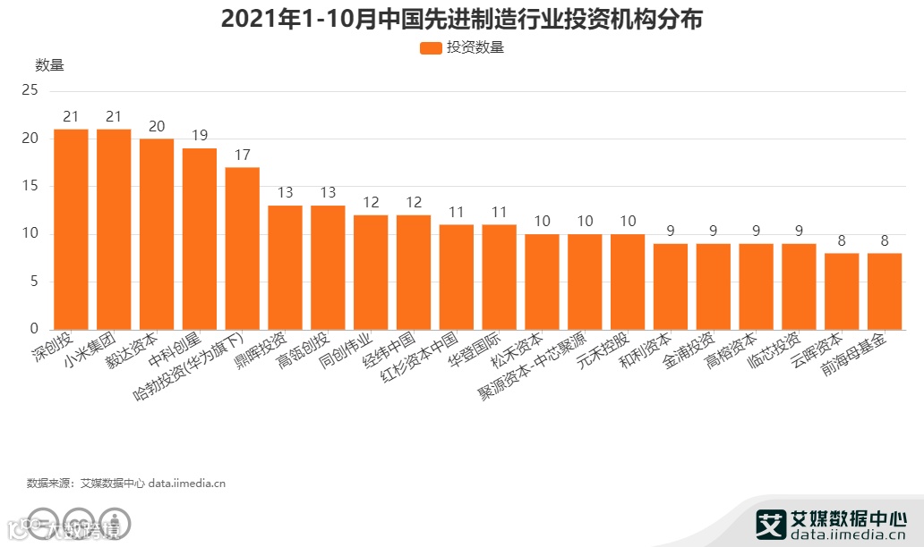 艾媒数据中心(data.iimedia.cn)数据显示,2021年1-10月,中国先进制造行业投融资事件中,深创投、小米集团为出手次数最多的机构,投资数量各为21次。其次,毅达资本出手20次,而中科创星、哈勃投资(华为旗下)、鼎晖投资、高瓴创投的出手次数分别为19次、17次、13次、13次。