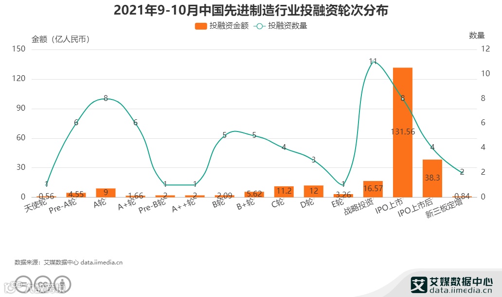艾媒数据中心(data.iimedia.cn)数据显示,2021年9-10月国内先进制造行业融资事件中,轮次分布最多在泛A轮(Pre-A轮、A轮、A+轮、A++轮),共21起,投融资金额共计17.21亿人民币;泛B轮(Pre-B轮、B轮、B+轮)和战略融资紧随其后,各为11起。其中,泛B轮(Pre-B轮、B轮、B+轮)投融资金额共计9.71亿人民币,而战略融资金额共计16.57亿人民币。此外,IPO上市、IPO上市后、C轮、D轮、新三板定增、E轮、天使轮投融资事件分别为8起、4起、4起、3起、2起、1起、1起。