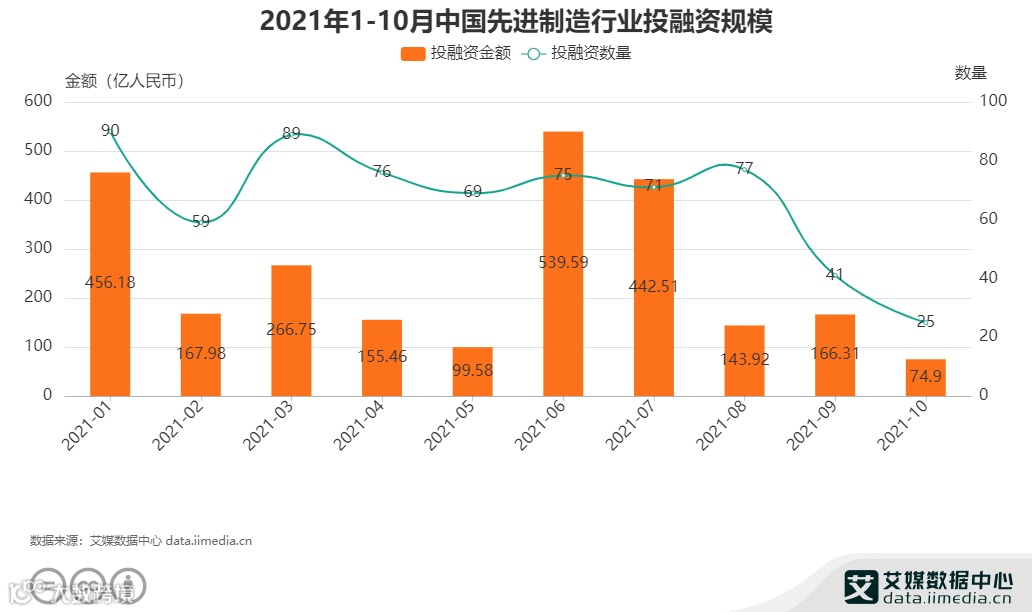 艾媒数据中心(data.iimedia.cn)数据显示,2021年9-10月中国先进制造行业投融资交易事件共66起,融资总规模达241.21亿人民币。分月来看,6月中国先进制造行业投融资金额为本年最高值,达到539.59亿人民币;1月投融资事件则为本年最多,共90起,投融资金额为456.18亿元。值得注意的是,4-7月,先进制造行业投融资数量较为稳定,而8月往后,先进制造行业投融资数量处于回落态势。对比来看,9-10月融资事件总量同比下降52.2%,而投融资交易金额同比减少46.9%。