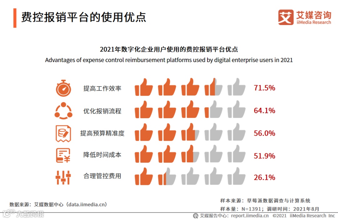 数据显示,数字化企业用户对费控报销平台的提高工作效率、优化报销流程、提高预算精准度、降低时间成本等优点进行了肯定,其中对于平台的提高工作效率认可度最高,占比达到71.5%。艾媒咨询分析师认为,费控报销平台所具备的现金数据处理技术,能迅速对数据进行计算处理,并在智能决策的数字框架下,形成较为合理的方案,极大地提高了企业的工作效率。