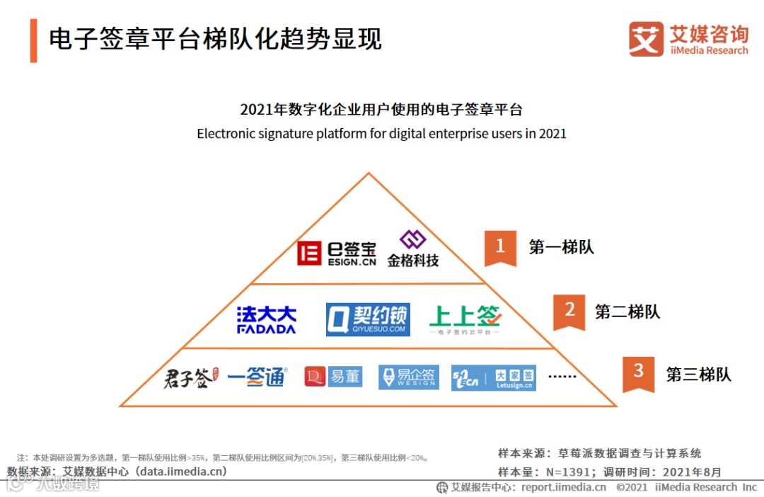 数据显示,数字化企业最常使用的电子签章平台中,e签宝、金格科技位于第一梯队,而法大大、契约锁等平台则位于第二梯队。艾媒咨询分析师认为,随着企业数字化转型的程度加深,在选择电子签章平台上,企业更偏向于选择大品牌、可信赖的电子办公服务提供商,以获得更优质、有保障的服务。