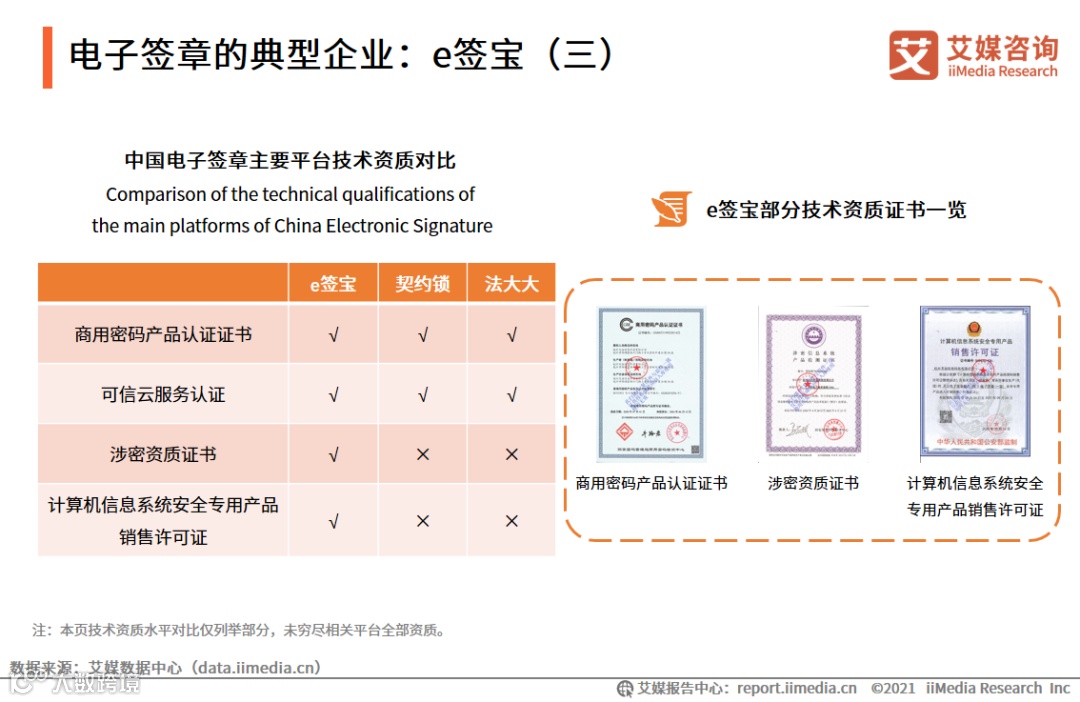 资本的注入为e签宝的技术发展提供了动力,目前e签宝已获得了52项著作权和16项发明专利,并获得了多项行业内独有的技术资质认证,在信息技术应用创新领域具有成熟的经验。艾媒咨询分析师认为,在如今逐渐庞大的企业数字化转型需求下,先进的电子签章技术是e签宝抢占市场的利器。