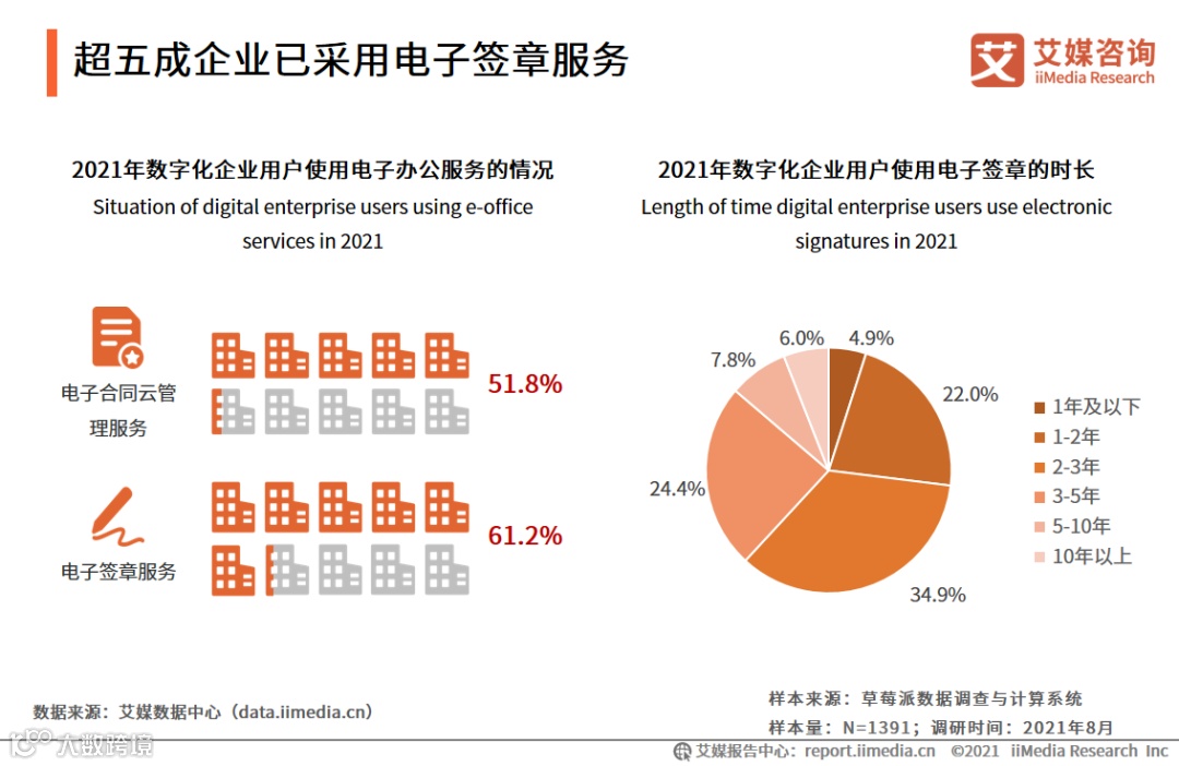 数据显示,51.8%的数字化企业用户使用过电子合同云管理服务,而使用过电子签章服务的比例为61.2%,而企业使用电子签章服务的时长低于3年的占比为61.8%,其中34.9%的企业使用时长在2-3年。艾媒咨询分析师认为,以电子合同、电子签章为代表的数字化办公服务在近年得到较大的普及,因其便捷、高效的优点获得了广大企业的青睐。