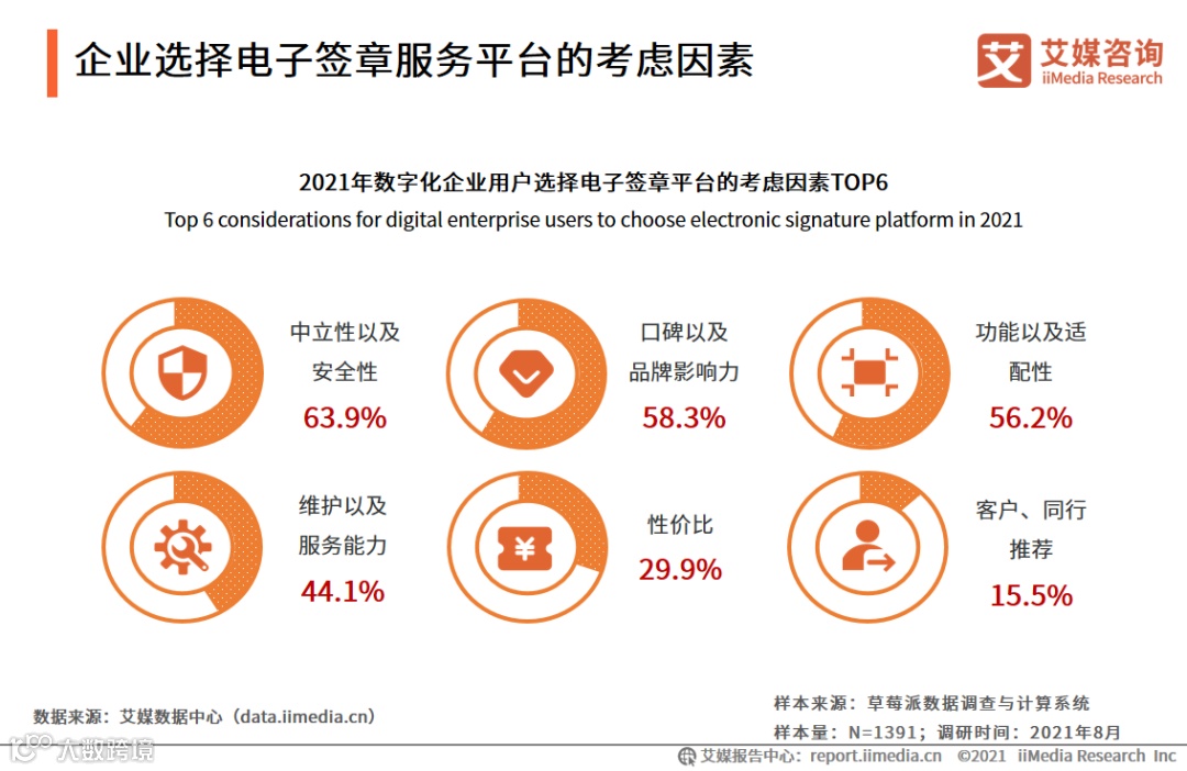 数据显示,数字化企业在选择电子签章平台前,会优先考虑该平台的中立性以及安全性,其次是平台的口碑以及品牌影响力,再而是平台的功能以及相关设备的适配性。艾媒咨询分析师认为,平台的第三方属性能最大程度地保持中立的立场,为用户提供平等的服务,而对数据安全所采用不同的保护措施成了平台与平台之间最显著的区别,越先进的数据安全技术,越能吸引更多的企业用户。