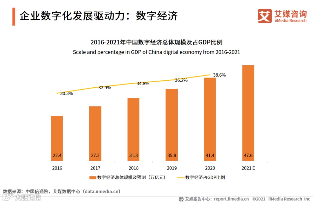 数据显示,2020年中国数字经济总体规模达41.4万亿元,占GDP比例为38.6%,预计2021年规模将达47.6万亿元。艾媒咨询分析师认为,中国数字经济已经成为驱动经济增长的重要力量,在这种背景下,企业需要加快数字化转型步伐,在数字化、网络化及智能化的浪潮中增强自身的发展竞争力。