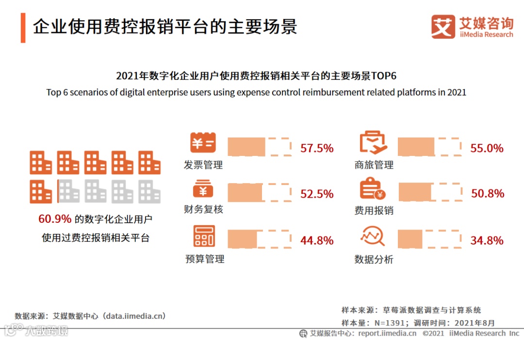 数据显示,超六成的数字化企业用户使用过费控报销相关平台,使用该平台的主要场景为发票管理、商旅管理、财务复核、费用报销等,其中发票管理占比为57.5%,位居首位。艾媒咨询分析师认为,费控报销平台所具有的智能化费用控制优势,受到大多数数字化企业用户的青睐,而在企业发票管理以及商旅管理中,限制多且流程繁琐,费控报销平台通过采取多种措施,进而提高管理的效率并降低管理的成本。