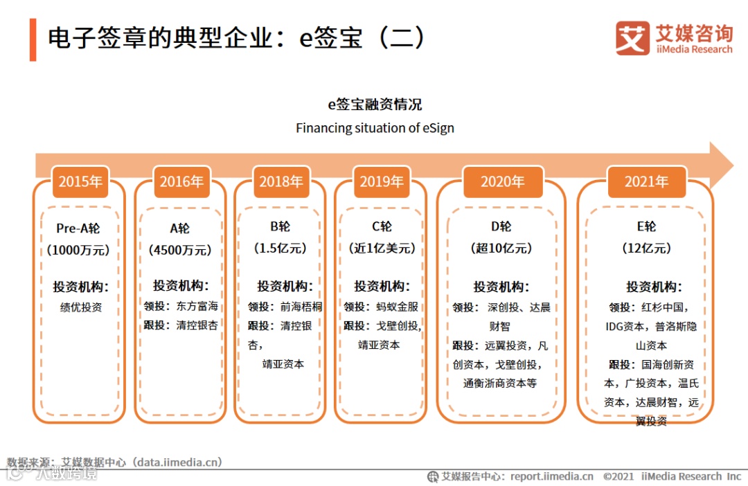 e签宝成立于2002年12月,作为中国互联网电子签章企业,致力于为客户提供具有法律效力的电子合同全生命周期服务,简化文件签署环节,提高合同签署效率。凭借服务能力和技术优势,e签宝获得了资本市场的关注,在2021年9月份完成了E轮融资。
