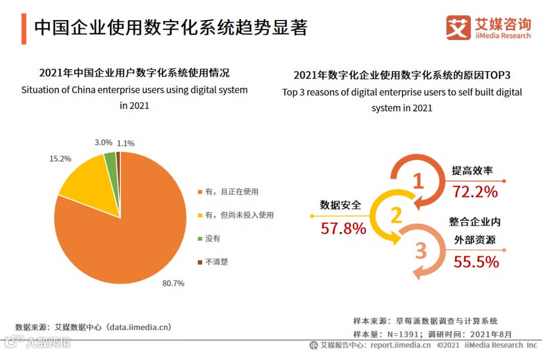 数据显示,超过八成的企业用户表示有使用数字化系统,15.2%表示公司正在布局数字化系统,但尚未投入使用。企业用户使用数字化系统主要是为了提高工作效率、保护数据安全以及整合企业内外部资源等。艾媒咨询分析师认为,随着企业服务行业的发展,企业数字化系统对于企业的运行效率、数据安全等方面都有很大程度的提升,促使多数企业都加快了数字化转型步伐,以提升业务转化、流程审批等环节的效率。