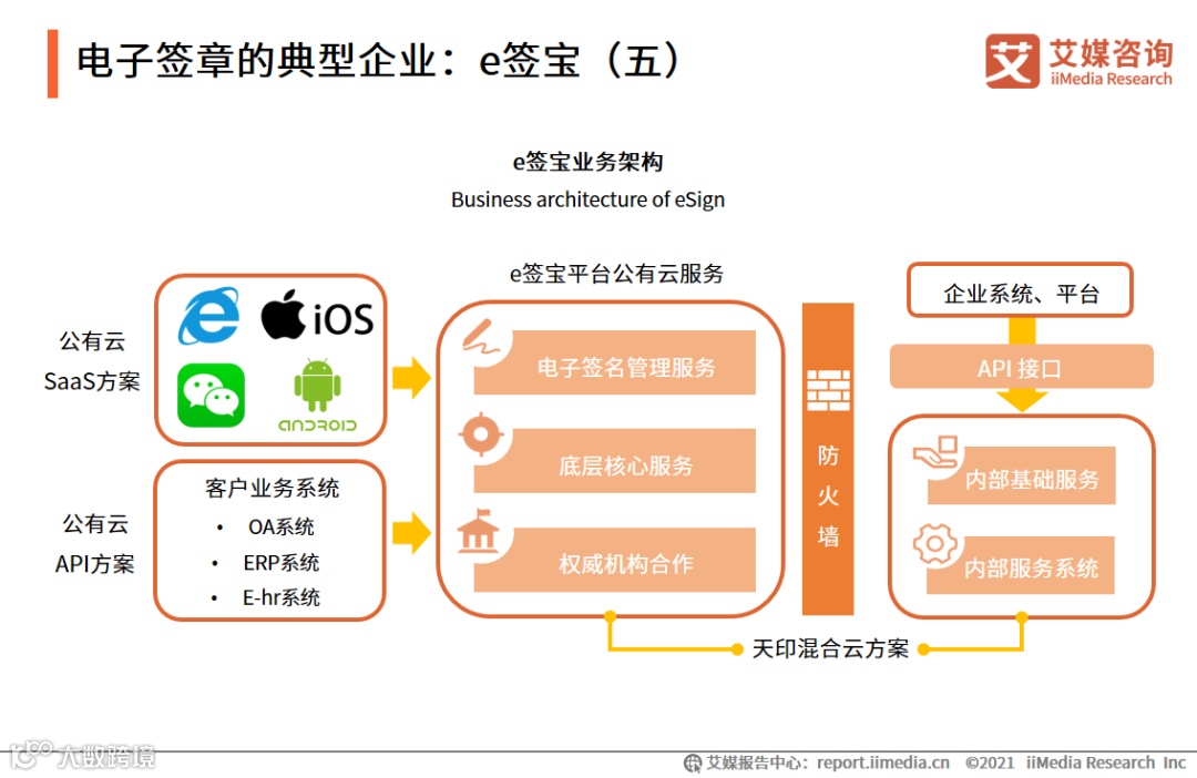 e签宝平台通过多种方案为不同用户提供合适并且高效的电子签章服务,其中方案分别为公有云SaaS、公有云API、天印混合云。公有云SaaS方案方便C端用户通过PC端web、移动端H5、微信小程序等七大终端链接平台服务,而API方案方便B端用户通过业务系统链接平台服务。天印混合云方案针对数据安全性极高的B端企业,为其提供公有云与私有云相结合的综合性服务。
