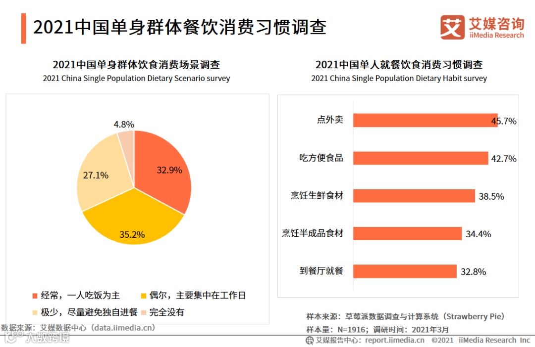 分领域来看单身群体需求,其中在饮食消费方面,相比非单身群体,单身群体更倾向于一人餐外卖和一人食方便食品。研究报告数据显示,68.1%单身人士表示一个人吃饭为常见的情况,其中32.9%人群更表示工作日以外的时间也以一人吃饭为主。一人食的情况下,选择点外卖的单身群体占比最高,占45.7%,其次是吃方便食品,占比42.7%。