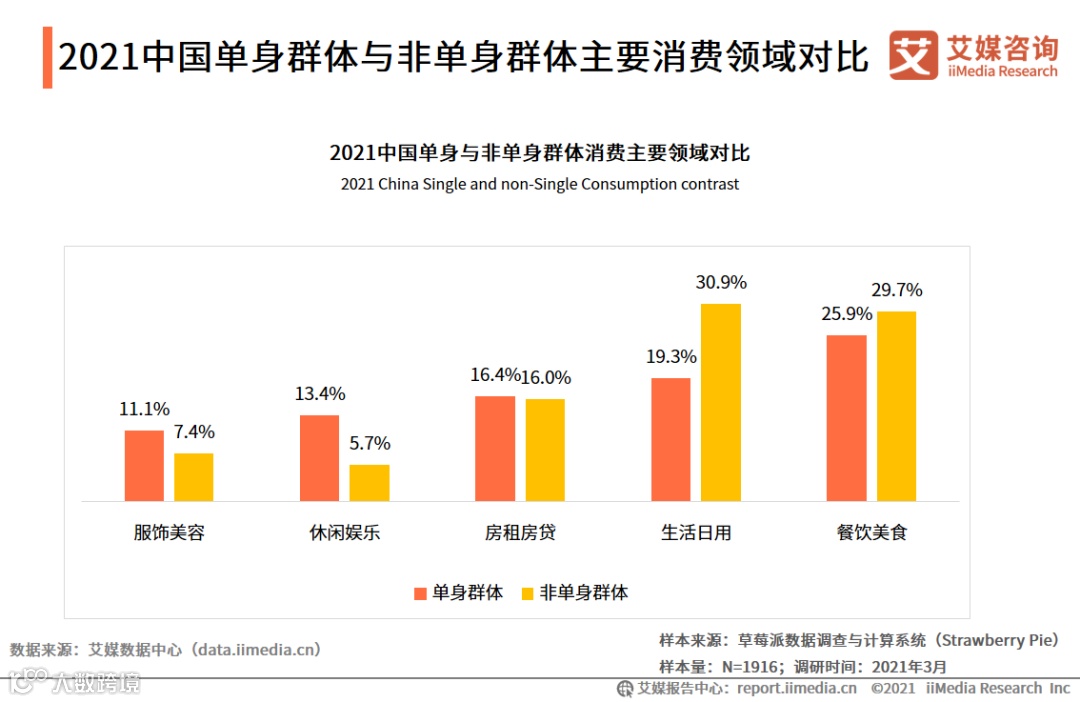 单身群体作为消费新势力,正在促进单身经济这一领域崛起。近期,iiMedia Research(艾媒咨询)发布了《2021中国单身群体消费行为调查及单身经济趋势分析报告》(下称“研究报告”),该研究报告围绕中国单身经济发展驱动力、单身群体生活消费调研、单身经济发展前景及趋势等进行分析解读。