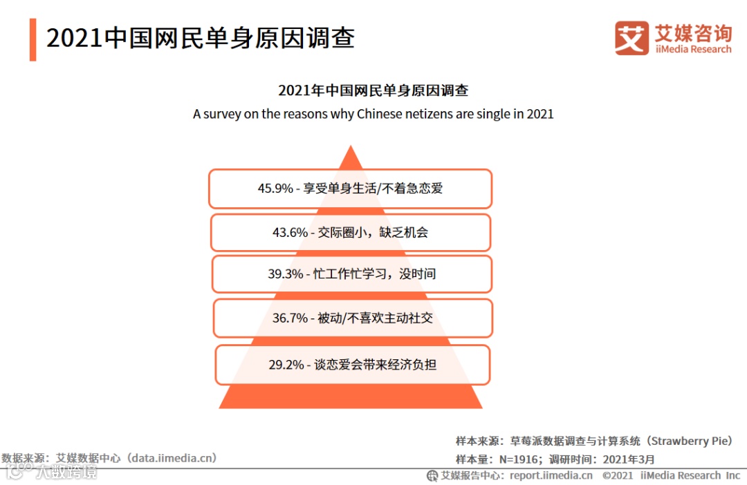目前,中国单身群体的主要特点为单身时间普遍较长,相应地,独居独处的时间也会加长。iiMedia Research(艾媒咨询)数据显示,2021年Q2,在中国单身时长以年为单位的单身人士已高达 73.01%,其中有43.60%的单身人士单身时长为3年以上;7.1%的人无恋爱经验。