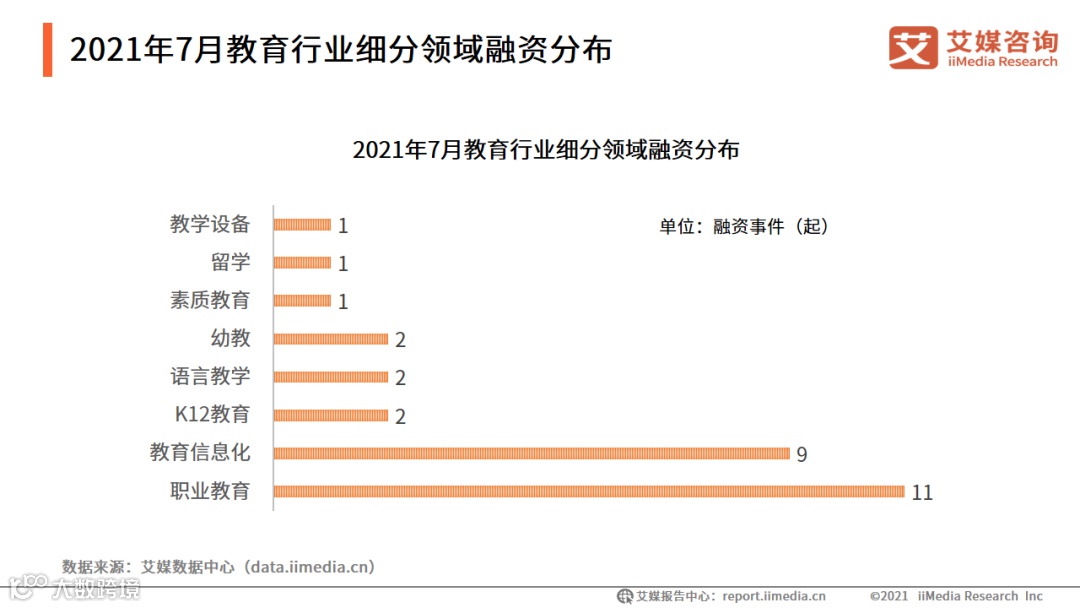 7 月融资事件细分领域中,职业教育融资数量为 11起,居于细分领域榜首;教育信息化以 9起的数额排在第二位。K12教育、语言教育、幼教领域融资数量各为2起,而留学、素质教育、教学设备领域融资数量各为 1 起。