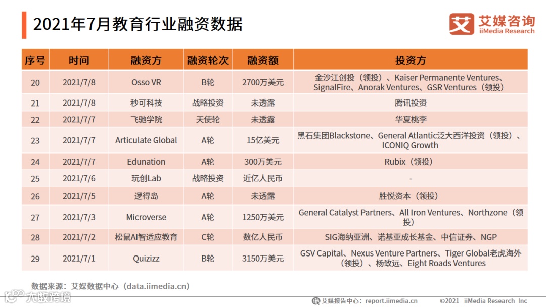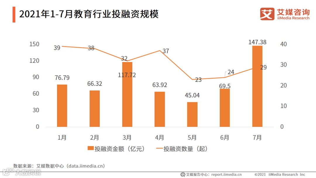 艾媒数据中心数据显示,2021年1-7月,教育行业共发生222起融资事件,共融资586.67亿元。2021 年 7月,教育行业共发生了 29起融资事件,共融资147.38亿元。与6月相比,融资总金额增加超1倍,融资事件数增加5起。